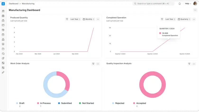 Production floor optimisation: Improve efficiency by tracking employee skills, assigning jobs intelligently, and reducing downtime. ERPNext’s integrated workforce management tools help allocate the right personnel for each task, enhancing overall productivity. IoT integration (not in-built) allows real-time shop floor updates, eliminating paperwork and streamlining operations.